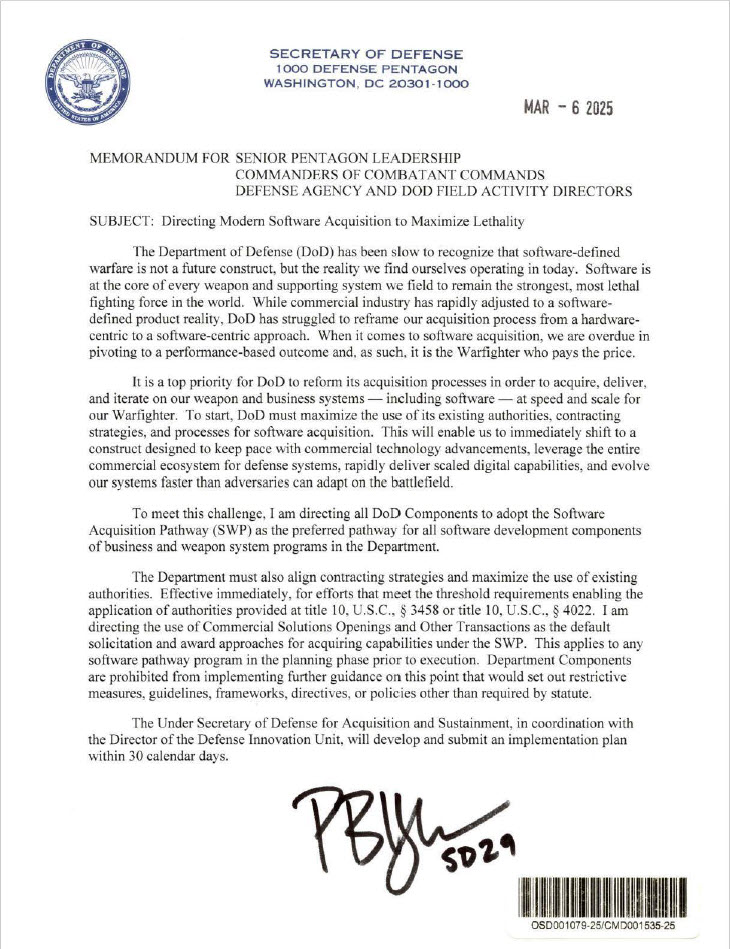 "AUVSI commends Secretary Hegseth for mandating the Software Acquisition Pathway across DoD. We have long advocated for DoD to source software from leading software firms, utilizing rapid acquisition tools like CSOs and OTAs. This ensures our warfighters receive the best technology faster than our adversaries can adapt—key to ensuring deterrence, readiness, and lethality." — Michael Robbins, President & CEO, AUVSI