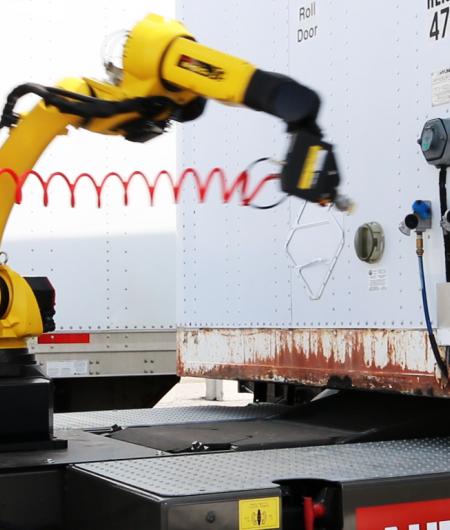 Equipped with automation-ready drive-by-wire electronic controls, the Terberg yard truck is driven to the trailer or dock by ASI software. Once at the location, a FANUC robotic arm uses proprietary technology to connect or disconnect the pneumatic brake line to the trailer, which makes it a truly end-to-end platform.
