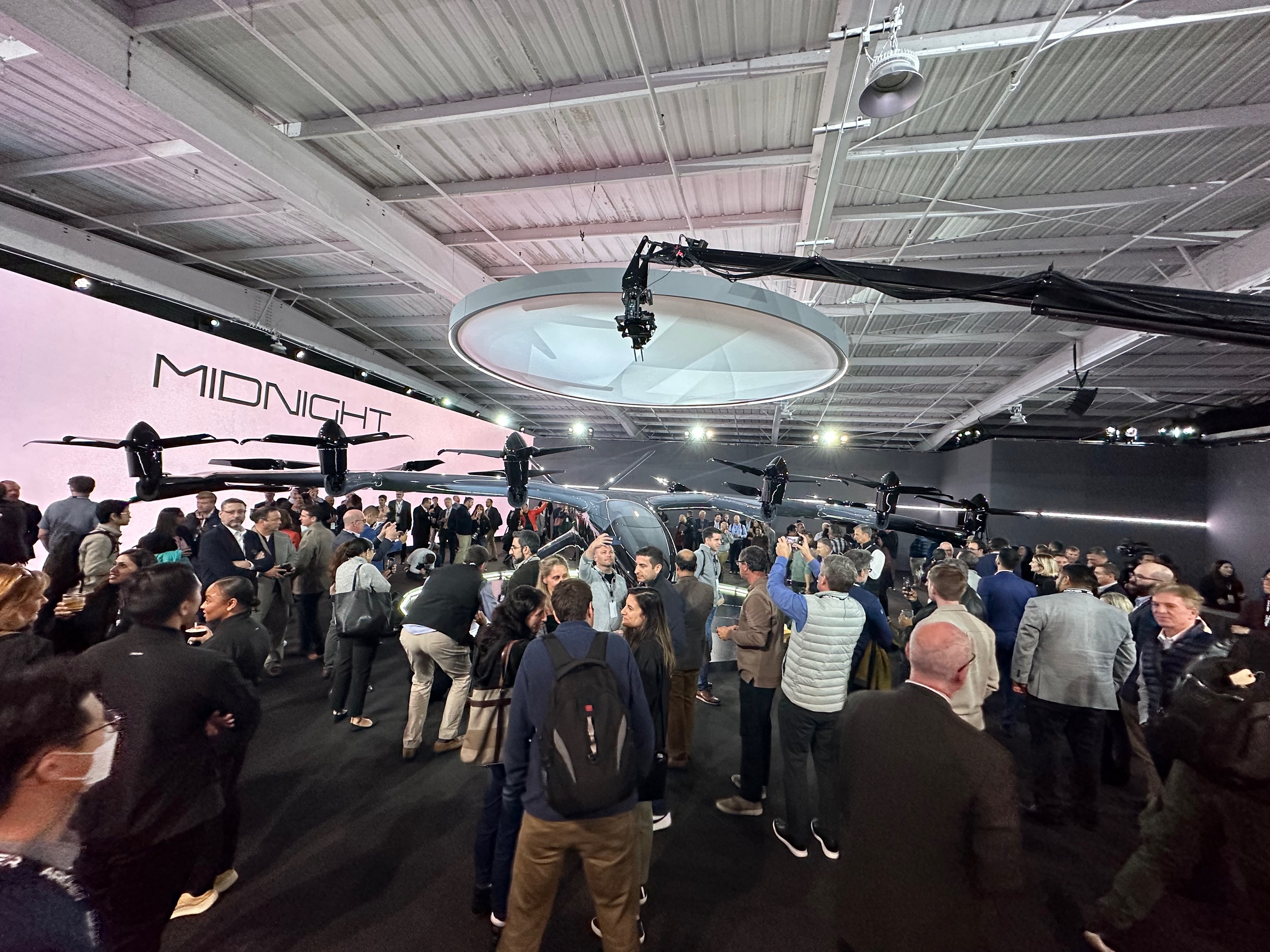 Given Archer’s flashy reveal for Maker, I wasn’t sure exactly what to expect when we walked across the street from the office to the Palo Alto Airport. They directed us to an outdoor lounge area with music and cocktails. After about 45 minutes of networking with people like AUVSI members from Honeywell and other industry association partners, they directed us inside a hangar with Midnight already on display under relative darkness.