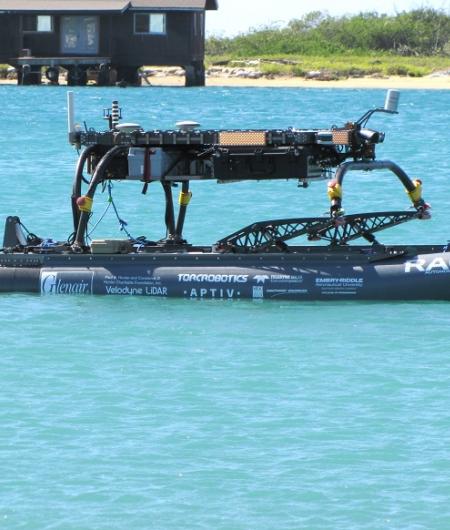 Built by engineering student members of the Robotics Association at Embry–Riddle, the 16-foot long boat navigated an open water obstacle course, adapted to the waves and wind on the bay, and launched and recovered a small submarine before returning to dock.