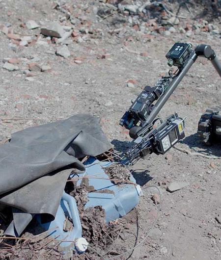 Weighing roughly 160 pounds, Centaur is a medium-sized UGV that provides a standoff capability to detect, confirm, identify, and dispose of hazards. The open-architecture robot is equipped with an advanced EO/IR camera suite, a manipulator arm that reaches over six feet, and the ability to climb stairs. Modular payloads can be used for CBRNE detection and other missions.