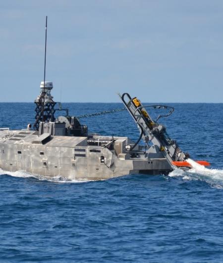 The AQS-24 D&R operated from the Mine Countermeasures Unmanned Surface Vessel (MCM USV), and showcased the unmanned operations necessary to perform a mine hunting mission off the MCM Mission Package aboard the littoral combat ship (LCS).