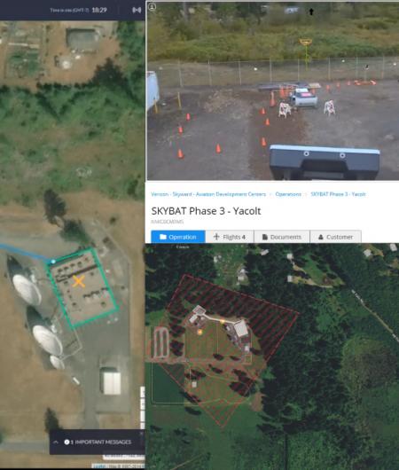 Photo below: Fully remote operations over video conference. Percepto drone system screen (left), camera from Fortem SkyDome showing drone taking off (top middle), and Skyward aviation management platform (bottom middle). Skyward flight operations team (right) from top to bottom: Dave Newell, Operations Manager (observing from Alaska, 1600 miles from site); X, Director of Aviation Development Centers (25 miles from site), Jake Weber, Remote Pilot in Command and Skyward Co-Founder (23 miles from site); and, Dustin Schocken, Remote Navigator (18 miles from site). Photo: Skyward