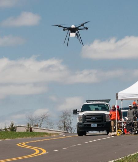 Below: This drone is carrying equipment designed to allow it to automatically detect and avoid other aircraft, as part of a research project conducted by the Virginia Tech Mid-Atlantic Aviation Partnership, the Virginia Tech Transportation Institute, NASA, and corporate partners.