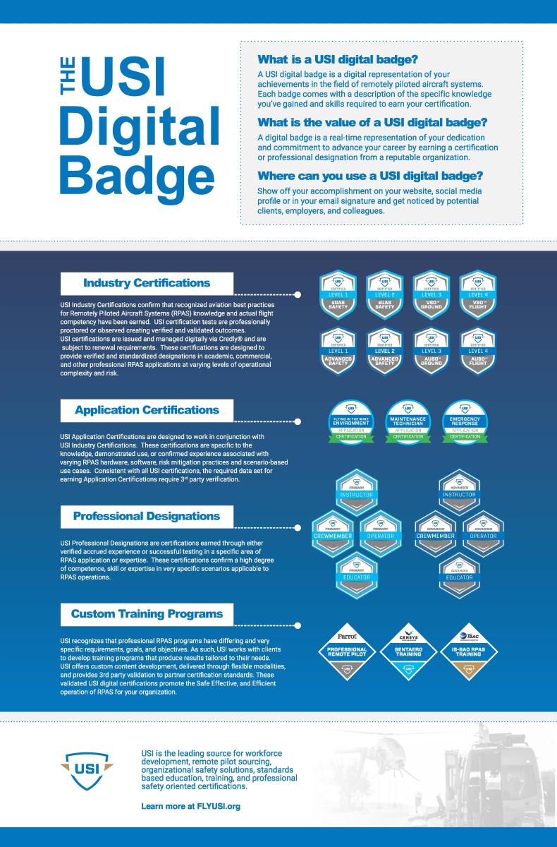 Josh Olds: Stage One drone training certification involves the primary certifications for lower risk profiles, such as Group One aircraft under 20 pounds operated within visual line of sight or a highly automated profile. We focus on flight training using that “train-the-trainer” model with certified USI educators and ground instructors. Stage Two training is for more advanced operations. In both stages, we incorporate a digital badge structure.